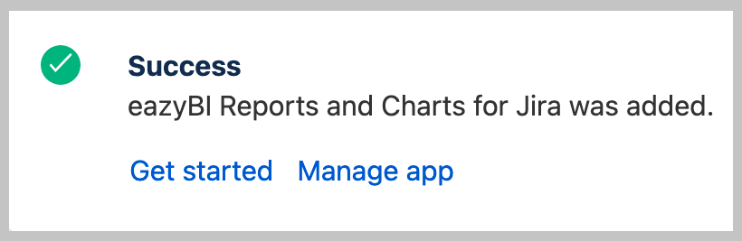 Once eazyBI is successfully installed you are ready to Get Started or Manage app.