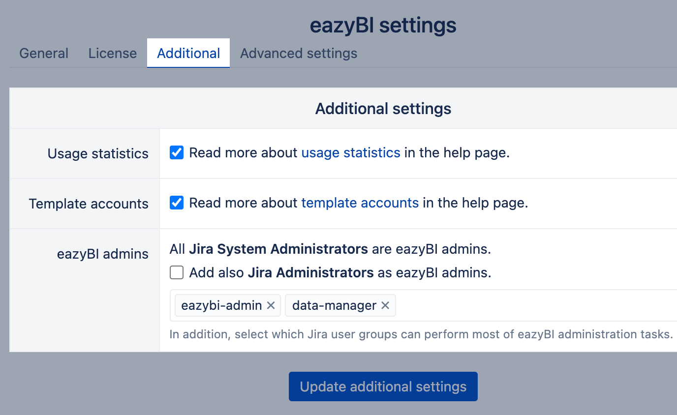 You can use eazyBI Additional settings to enable some additional properties for eazyBI administration. You can enable usage statistics for eazyBI and add Jira user groups as eazyBI admins.