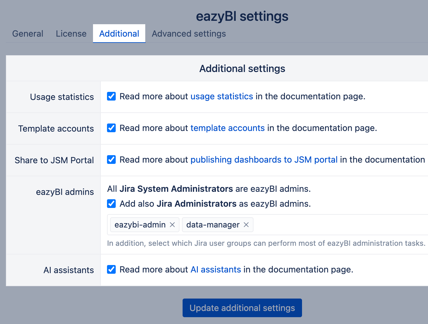 You can use eazyBI Additional settings to enable some additional properties for eazyBI administration and instance setup.