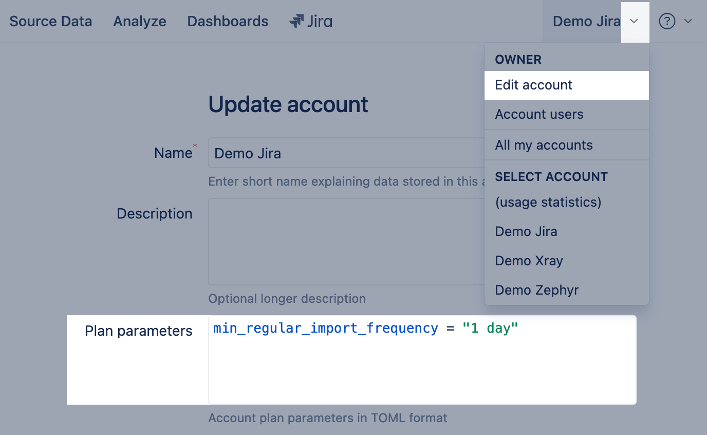 2) Open an account where you want to limit the minimum regular import frequency and select Edit account from the top navigation menu. Set import frequency in Plan parameters for this account: