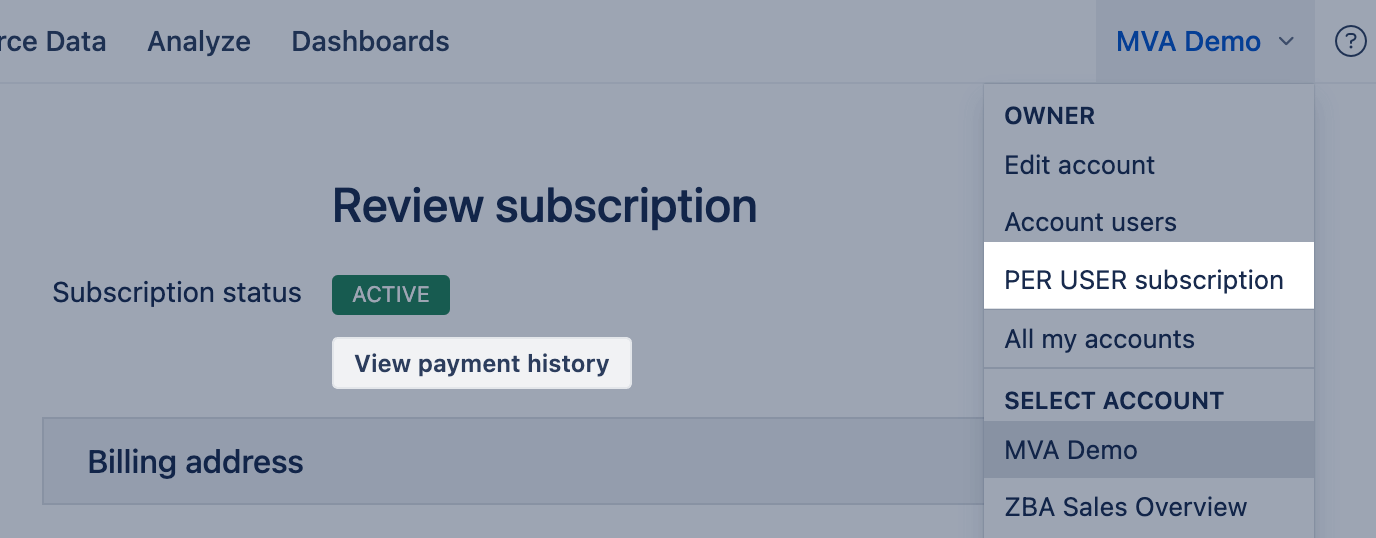 On the subscription page (click on the account name in the top-right corner and select PER USER Subscription), the account Owner can make several changes to the eazyBI Subscription: