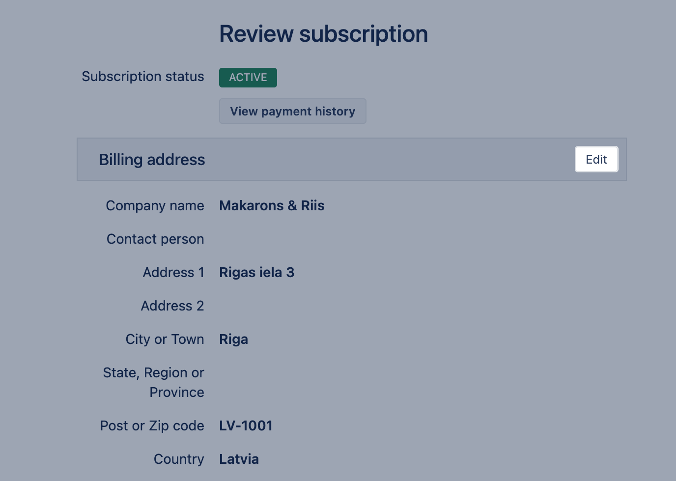 After that, you will be redirected to create a new subscription page where you will need to enter your billing address (and enter your VAT number as well if you are an EU country company) and click Create button. In the Edit account page, select Change subscription plan and review subscription plan: PER USER, FREE, or PUBLIC.