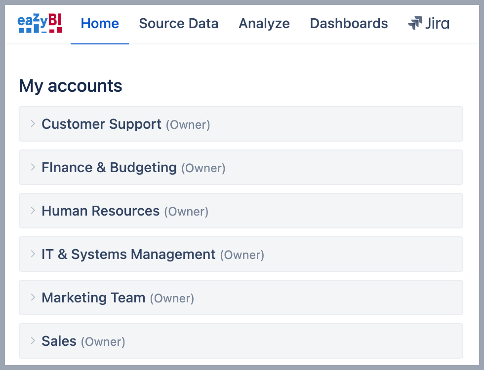 - Create a separate account for each end-user group. Depending on end-user needs, you might need to import different metrics or focus on another set of projects. Clearly define the purpose of the eazyBI account, who will use it, and for what purpose. Consider creating different accounts for teams or departments if their reporting needs are distinct, for example, team performance tracking, project-specific analysis, executive-level dashboards, geographic location, customer portal, etc.