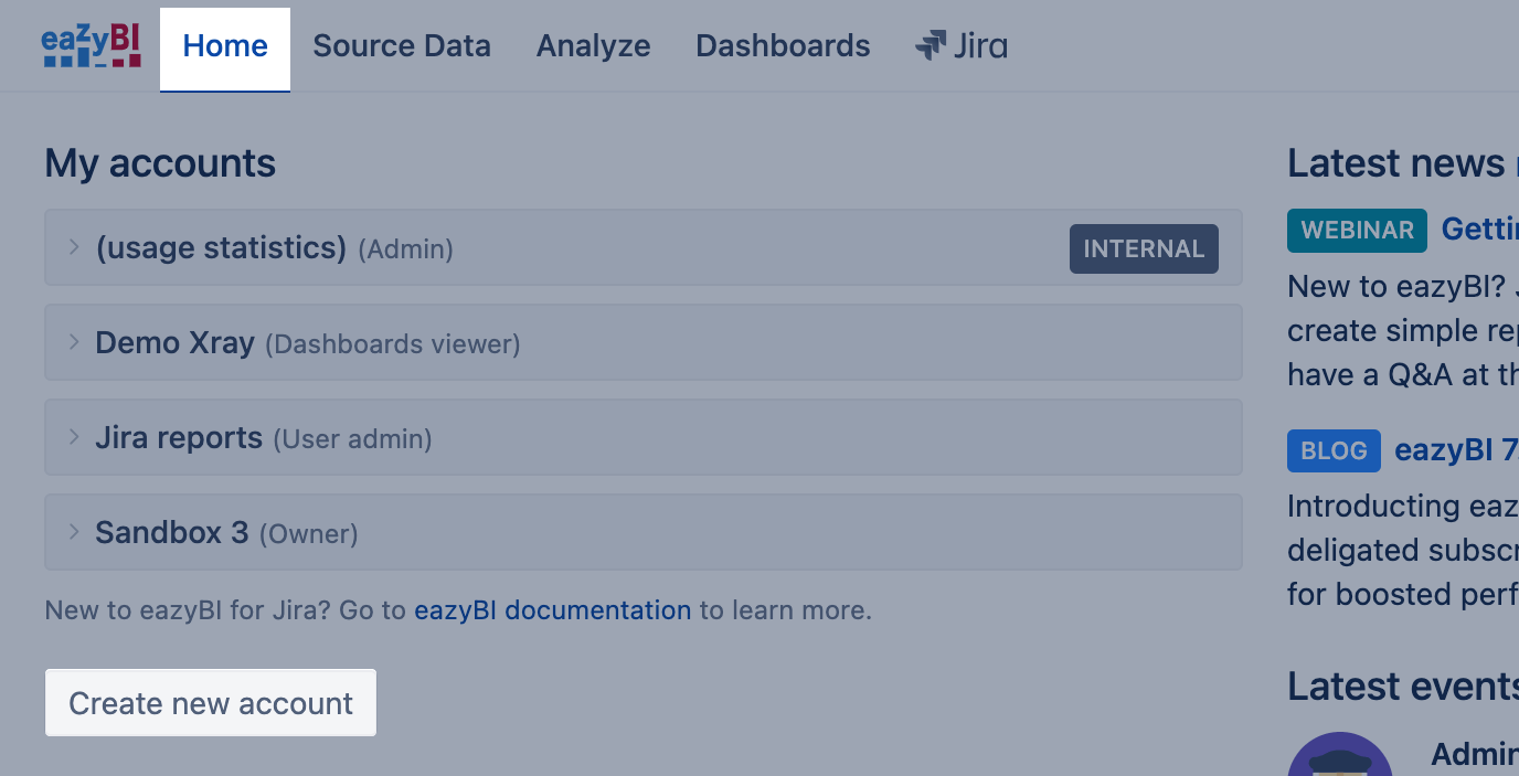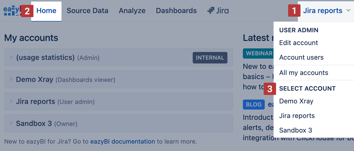 One eazyBI account contains a set of data that can be analyzed by one or many account users. At any given time, you can work with one selected current account [1]. You can select a current account either from the Home tab [2] or from the account selection drop-down in the top-right header menu [3].