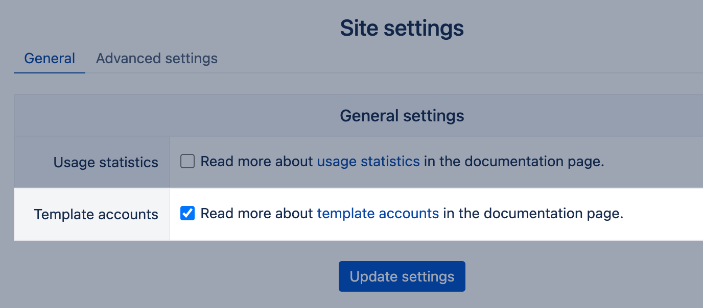 To enable template account creation in eazyBI for Jira Server or Data Center or Confluence Server or Data Center, go to Settings → Additional and select the option "Template accounts".