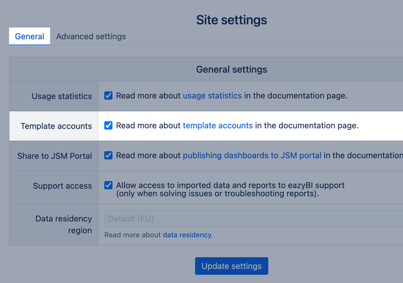 To enable template account creation in eazyBI for Jira Data Center or Confluence Data Center, go to Settings → Additional and select the option "Template accounts".